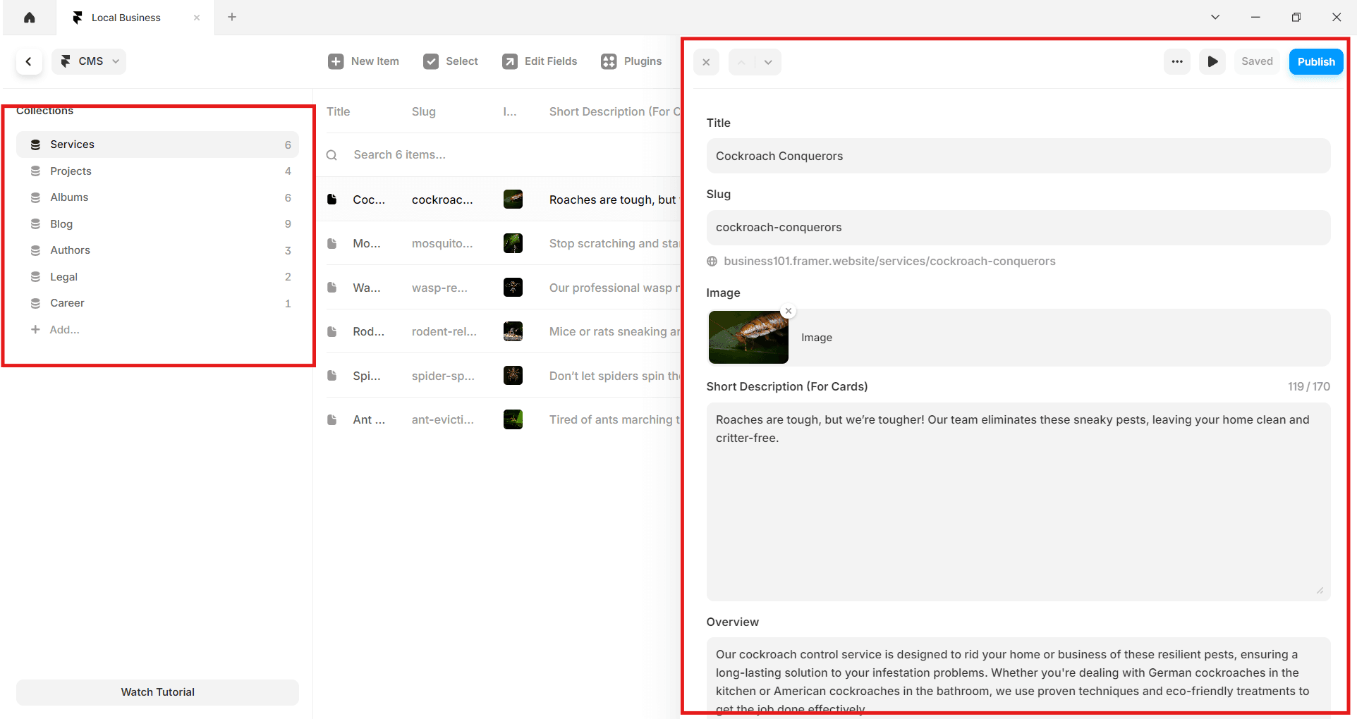 Finally, editing contents in CMS. In this project, SERVICES, PROJECTS, ALBUMS, BLOGS, AUTHORS, LEGAL, CAREER pages are under CMS. Go to the CMS collections from topbar and edit your contents there. Very Easy to manage everything, right!!!